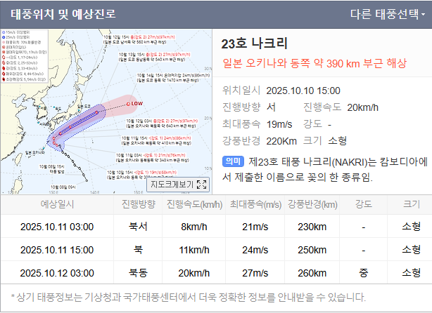 나크리는 9일경 일본 오키나와 동남동쪽 해상에 접근한 뒤, 10일에는 오키나와 동쪽 해상에 근접할 것으로 예보되었습니다. 이후 11일 오후에는 일본 가고시마 남쪽 약 360km 부근 해상을 지나며 북동쪽으로 방향을 급격히 틀 가능성이 큽니다.